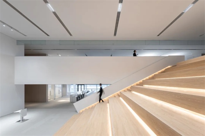 裙楼层面之上叠加座落的建筑体块内分布着企业不同部门的工作团队,宽敞明亮的办公区域可根据具体需求灵活调整。可开放窗扇令办公空间实现自然通风换气。跨越不同楼层的通高中庭与大型阶梯设计,服务于办公层之间垂直交通流线的同时,也可作为举行跨团队讲座与聚会活动的场所。另外,各个办公层还配备一个特殊的非正式交流空间,此处设有茶水间、休憩区、图书馆、健身区域等。裙楼屋顶是开敞的露台空间,拥有无边际泳池、篮球场、烧烤站点等休闲设施专供唯品会员工与客户使用,营造具有绝佳江景视野的一方天地,让人们尽享午休或下班时光